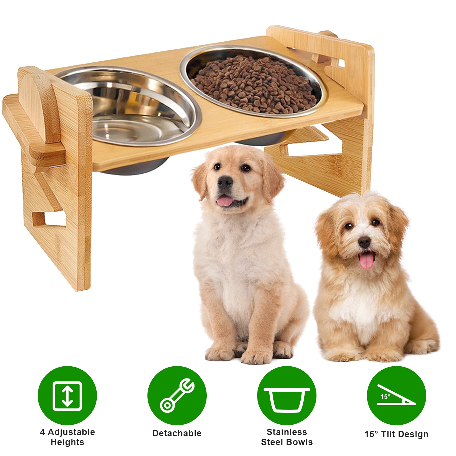 Home > Bamboo Double Dog Raised Bowls 15° Tilt Elevated Dog Bowls with 4 Adjustable Heights 2 Stainless Steel Bowls Pet Feeder for Dogs Cats Rabbits