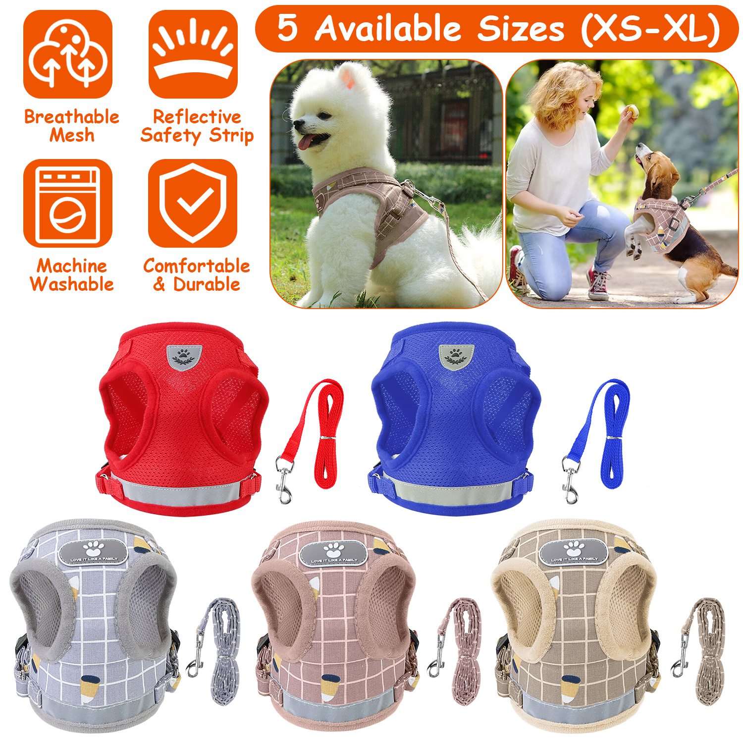 Made of 100% polyester with soft edges and breathable mesh padding, come with adjustable harness and paste strip, our pet chest strap can provide extra comfort and protection. A long reflective strap makes your dog more visible and safe in dark, great for going out at night. 360° Rotatable clasp and 3.94ft leash allow your dog to play outside with freedom. Five sizes and colors are provided for more choices.